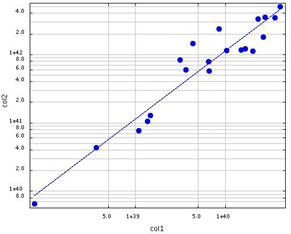 Con il programma TopCat abbiamo rappresentato ogni galassia su un grafico identificando ognuna con un punto avente per ordinata la loro luminosità in B e per ascissa la luminosità dovuta alle emissioni H . In seguito abbiamo sostituito i valori ( x ; y ) di ogni punto con il logaritmo degli stessi: ( log(x) ; log(y) ). I punti si sono così disposti in modo da evidenziare una possibile funzione lineare
