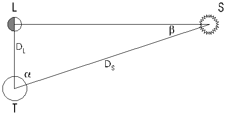 In termini trigonometrici ciò significa che l'angolo b = 3° e che il rapporto tra la distanza Terra-Luna (DL) e la distanza Terra-Sole (DS) è pari al seno di b