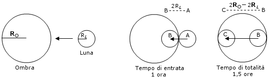 Se indichiamo con RO il raggio dell'ombra e con RL il raggio della Luna è facile verificare come il percorso effettuato dalla Luna per entrare completamente nel cono d'ombra (A → B) è pari a 2RL. Il tempo necessario per effettuare tale percorso è di circa un'ora. Infatti, poiché la Luna impiega circa 30 giorni (29,5 giorni) per completare una rivoluzione di 360° rispetto al sistema Terra-Sole, essa si muove di 360°/30 = 12° al giorno = 0,5° all'ora. In altre parole impiega un'ora per spostarsi di un suo diametro.