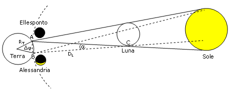 L'arco AB posto sulla superficie terrestre, di ampiezza pari alla differenza di latitudine (Δφ = 10°) tra l'Ellesponto ed Alessandria, ha invece una lunghezza pari a