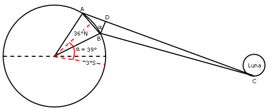 Tale risultato è stato ottenuto ponendo il Sole e la Luna allo zenit tra Ellesponto ed Alessandria, perpendicolare dunque ad una latitudine, intermedia tra 41° e 31°, pari a 36° . Possiamo affinare il risultato se consideriamo che il 14 Marzo la declinazione del Sole è di circa 3° Sud.