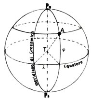Coordinate: latitudine (φ),misura angolare dell'arco di meridiano compreso tra il parallelo passante per il punto e l'equatore; longitudine (λ), misura angolare dell'arco di equatore compreso tra il meridiano passante per il punto e il meridiano fondamentale (Greenwich).