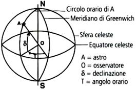 Coordinate: declinazione ed angolo orario locale (t), la misura angolare dell'arco di equatore celeste compreso tra il meridiano celeste passante per l'astro e il meridiano superiore, o angolo orario di Greenwich (T), la misura angolare dell'arco di equatore celeste compreso tra il meridiano celeste passante per l'astro e la proiezione del meridiano di Greenwitch sulla sfera celeste, si misura in senso orario a partire dal meridiano di riferimento.
