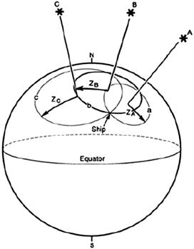 Calcolo del punto nave Per ottenere un punto nave affidabile si cerca l'intersezione fra tre o più cerchi d'altezza.