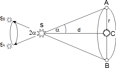 Eseguendo due osservazioni di una stella relativamente vicina a distanza di 6 mesi, è possibile individuare una sua oscillazione rispetto allo sfondo delle stelle fisse. In 12 mesi le stelle più vicine sembrano infatti percorrere un ellisse sullo sfondo delle stelle più lontane (fisse). Tale ellisse non è altro che la proiezione dell'orbita della terra sulla sfera celeste. L'angolo 2 sotto il quale noi osserviamo l'asse maggiore di tale ellisse apparente è lo stesso sotto cui un osservatore posto sulla stella osserverebbe l'asse maggiore dell'orbita terrestre. La metà di tale angolo, pari ad , è detto parallasse annua della stella. Tale angolo permette la misura della distanza d della stella (o del pianeta in caso di parallasse diurna). Ricordando infatti che in un triangolo rettangolo il rapporto tra le misure dei cateti è pari alla tangente dell'angolo opposto al primo cateto, potremo scrivere: