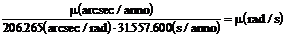 dove, 206.265 è il numero di secondi di grado contenuti in un radiante (ed anche il numero di unità astronomiche contenute in un parsec) e 31.557.600 è il numero di secondi di tempo contenuti in un anno giuliano di 365,25 giorni. In definitiva si avrà