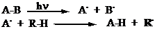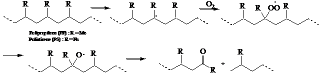 a) Scissione termica o fotochimica di perossidi XO-OX. I perossidi sono usati come iniziatori nelle rezioni di polimerizzazione e si trovano sempre in tracce inglobati nel polimero. Per effetto della luce o del calore il perossido decompone fornendo alcossi radicali che, a causa della grande energia del legame XO-H (X = alchile), sono ottimi idrogeno estrattori.