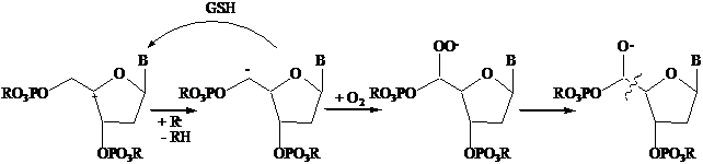 A livello di DNA il danneggiamento è determinato principalmente da estrazione di idrogeno da una delle 5 posizioni dell'unità zuccherina (deossiribosio), in particolare dalla posizione C5'. Il radicale generato può ripararsi per estrazione idi idrogeno dal glutatione, un antiossidante tiolico presente in alte concentrazioni nella cellula, o re intrappolato dall'ossigeno, con conseguente rottura del filamento e morte della cellula.