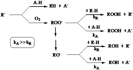 L'autoossidazione produce sempre idroperossidi (ROOH) che, a loro volta, generano radicali che innescano altre catene auto-ossidative (autocatalisi). L'aggiunta di sostanze riducenti, come solfuri (R'2S) o fosfine (R'3P) determina la distruzione riduttiva dei perossidi.