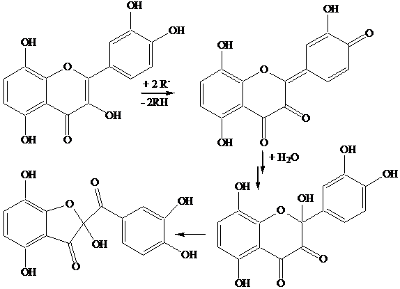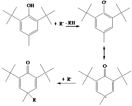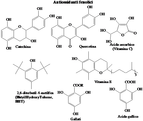 I fenoli sono buoni idrogeno donatori, a causa della debole forza del legame O-H. L'ossi radicale che si forma, delocalizzato sul nucleo benzenico, si spegne per accoppiamento in para o, se è presente una seconda funzione OH, per ulteriore idrogeno donazione. A titolo esemplificativo sono mostrati i meccansimi di ossidazione della quercetina, un antiossidante appartenente alla famiglia delle catechine contenuto in molte verdure (cipolla, cavolo), e del BHT, un antiossidante molto usato nell'industria alimentare. Si noti come una molecola di antiossidante blocca due specie radicaliche R., inibendo così la propagazione di due catene.