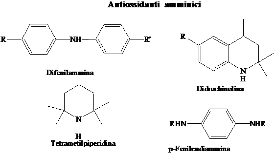 Sono derivati della defenilammina, della para-fenilendiammina e della diidrochinolina. Questi ultimi sono molto usati come a.o. nel mangime per animali. Sono molto più efficaci degli a.o. fenolici, perché l'amminil radicale aromatico è molto stabile, quindi l'estrazione di idrogeno dall'ammina è un processo molto veloce. Tuttavia i prodotti di ossidazione sono colorati, e questa è una caratteristica negativa per i materiali.