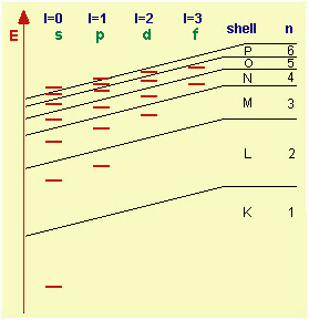 Fig.9.1 Schema energetico per i vari tipi di orbitali, distinti in s, p, d, f, al variare del numero quantico n; ad ogni n corrisponde un guscio o shell. Seguendo le regole su indicate, e conoscendo la sequenza di energia per gli orbitali, indicata in figura, si può sapere, per ogni atomo, quali sono quelli occupati e si può procedere all'aufbau, cioè al riempimento progressivo degli orbitali con gli elettroni. n definisce il cosiddetto 'guscio', o 'shell'; così, per esempio, per n=1 avremo il guscio K, per n=2 L, per n=3 M, etc. Entro un guscio, orbitali con l più alta sono a E più alta, sempre a causa delle interazioni elettroniche. m (momento angolare) e ms (momento di spin), nella Aufbau, non hanno influenza sull'energia degli orbitali, poichè indicano solo l'orientazione della corrente elettronica sotto l'effetto di un campo, che quando si parla di atomi isolati, non c'è. |