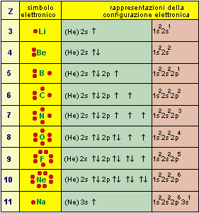 N.B. E' chiaro, quando scrivo 1s2, che i due elettroni che si trovano nell'orbitale 1s devono essere obbligatoriamente a spin antiparalleli per il principio di Pauli; perciò scrivo semplicemente il loro numero; analogamente, quando scriverò 2p3 è implicito che i tre elettroni occupino ognuno un orbitale p e che siano tutti e tre a spin parallelo, per il principio di Hund. Questo è un esempio della complessa significatività delle simbologie che usa il chimico e della necessità di possedere profondi requisiti di conoscenza per poter comprendere il significato profondo dei simboli usati.