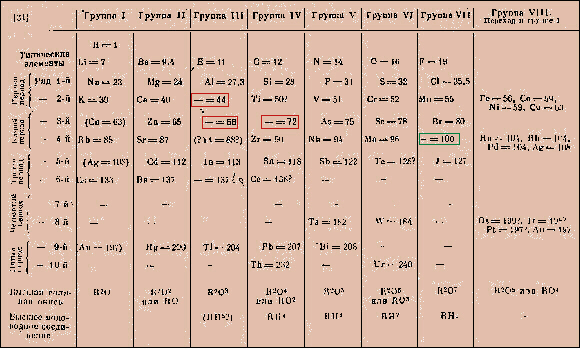 Fig.9.6 Prima stesura organizzata della Tavola di Mendeleev (1869-71) Nei riquadri rossi le posizioni dei previsti ekaboro (peso atomico 44), ekaalluminio (68) ed ekasilicio (72). Gli atomi corrispondenti, scoperti successivamente, sono: scandio Sc (massa atomica corretta 44,96), gallio Ga germanio Ge Nel riquadro verde l'atomo previsto con peso 100, corrispondente al tecnezio Tc (98), artificiale e radioattivo, individuato solo molto dopo. |
