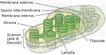 Il cloroplasto è un organulo dalla forma ovoidale, la cui membrana interna presenta dei ripiegamenti a forma di minuscoli sacculi appiattiti detti tilacoidi che si sviluppano nello stroma. In alcune regioni i tilacoidi si sovrappongono andando a costituire una sorta di "pila di monete" detta grano (granum).