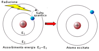 Come abbiamo già visto, gli elettroni degli atomi si muovono anch'essi in livelli energetici definiti (quantizzati) e per passare da un livello energetico inferiore (più vicino al nucleo) ad un livello energetico superiore (più distante dal nucleo) possono assorbire solo una quantità di energia ben definita, pari alla differenza di energia tra il livello energetico di arrivo e quello di partenza.