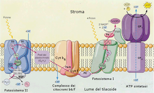 Gli elettroni vengono successivamente ceduti dall'accettore primario del fotosistema II attraverso una catena di trasporto degli elettroni, al centro di reazione del fotosistema I che si trova ad un livello energetico inferiore. Durante questa discesa si libera energia che viene utilizzata per sintetizzare ATP (fotofosforilazione) L'ATP è il primo prodotto della fase luminosa, che verrà utilizzato nella fase oscura.