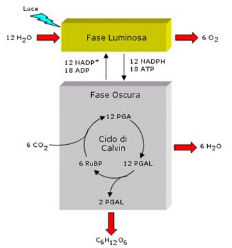 Nello schema generale della fotosintesi si possono distinguere due fasi collegate tra loro: una fase luminosa, fotochimica, ed una fase oscura, chimica.