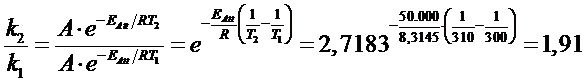 Calcoliamo il rapporto delle costanti cinetiche per un aumento di 10° a bassa temperatura da 300K a 310K