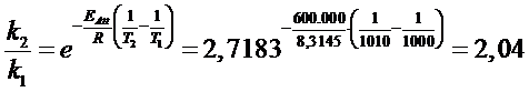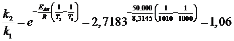 Calcoliamo il rapporto delle costanti cinetiche per un aumento di 10° ad alta temperatura da 1000K a 1010K
