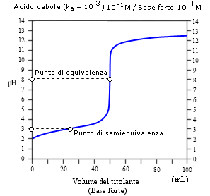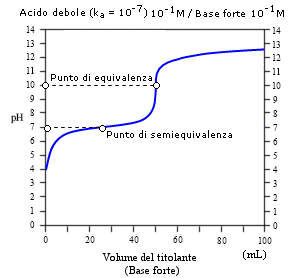 Al punto di semiequivalenza la soluzione presenta un pH pari al pk dell'acido debole. La curva di titolazione presenta un flesso in corrispondenza del punto di semiequivalenza (la pendenza da negativa diventa positiva)