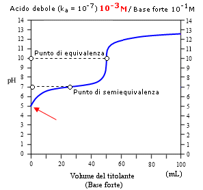 Al punto di equivalenza, siamo in presenza di un flesso (la pendenza da positiva ritorna negativa) e tutto l'acido è stato salificato. In soluzione è presente il sale di un acido debole che dà quindi idrolisi basica. La sua concentrazione è pari al numero di moli iniziali dell'acido (nA = CAVA) diviso il volume totale della soluzione (Vtot = VA + VB = VA + Veq)