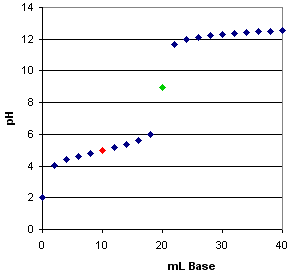 Si tenga presente che quando il numero di equivalenti di base aggiunti è metà del numero di equivalenti di acido (nB = ½ nA e quindi anche VB = ½ Veq) l'acido è stato per metà trasformato nel suo anione A- (punto di semiequivalenza)