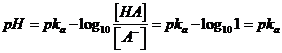 All'interno della regione tampone si trova il punto di semiequivalenza, in cui sono stati aggiunti alla soluzione un numero di equivalenti di base forte pari alla metà di quelli necessari per salificare completamente l'acido. In questo modo in soluzione è presente una quantità di acido indissociato pari alla quantità del suo anione. Il loro rapporto vale 1 e dunque