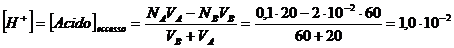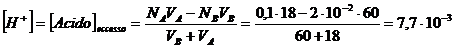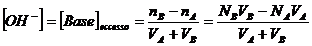 Calcoleremo dunque il numero di equivalenti della base in eccesso (l'acido è stato completamente salificato) e li divideremo per il volume totale della soluzione (VA + VB), ottenendo in tal modo la concentrazione della base forte in eccesso. Essendo la base forte (e quindi completamente dissociata), tale concentrazione corrisponderà alla concentrazione degli ioni OH- in soluzione.