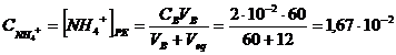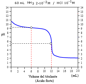 Costruiamo la curva di titolazione di 60 mL di una soluzione 2 10-2 M (= 2 10-2 N) di ammoniaca NH3 usando come titolante una soluzione 0,1 M (= 0,1 N) di HCl. Per l'ammoniaca kb = 1,8 10-5 (pkb = 4,74). Eseguiamo calcoli di pH per ogni aggiunta di 2 mL di soluzione titolante.