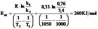 Ad esempio, sapendo che per la reazione di primo ordine 2N2O → 2N2 + O2, la costante di velocità specifica a 1000 K vale 0,76 s-1, mentre a 1050 K diventa 3,4 s-1, calcoliamo l'energia di attivazione