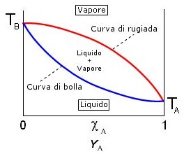 Se in ascissa si riporta sia la frazione molare della soluzione (c) che del vapore (Y) si ottengono due curve a pressione costante (isobare) che costituiscono il cosiddetto diagramma lenticolare. La curva inferiore, che rappresenta la temperatura alla quale il liquido bolle, è detta curva di bolla. La curva superiore, che rappresenta la temperatura alla quale il vapore condensa, è detta curva di rugiada. All'interno della lente è presente un sistema bifasico liquido + vapore in reciproco equilibrio