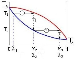 Per descrivere il processo di distillazione si fa riferimento alla curva che lega la temperatura di ebollizione della soluzione alla frazione molare del componente più volatile. Il componente più volatile è ovviamente quello con la più alta tensione di vapore e quindi con la più bassa temperatura di ebollizione. TB è la temperatura di ebollizione del componente B puro e TA è la temperatura di ebollizione del componente A puro.