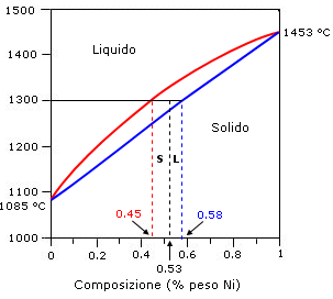 Esempio Consideriamo una lega Nichel-Rame contenente il 53% in massa di Nichel. Il Nichel puro fonde a 1453 °C, mentre il Rame puro fonde a 1085°C. A 1300°C si forma un sistema bifasico con il solido in equilibrio con il suo fuso. Nel diagramma lenticolare a destra vediamo che l'isoterma di 1300 °C incontra la curva di Liquidus (curva rossa = temperatura di solidificazione del liquido in funzione della % in massa del Nichel nel liquido) in corrispondenza di una concentrazione in massa di Nichel pari al 45%, mentre incontra la curva di Solidus (curva blu = temperatura di fusione del solido in funzione della % in massa del Nichel nel solido) in corrispondenza di una concentrazione in massa di Nichel pari al 58%. In altre parole, quando una lega metallica fonde genera un fuso più ricco nel componente a minor punto di fusione (Rame) e quindi più povero nel componente a maggior punto di fusione (Nichel). Ovviamente il solido residuo in equilibrio con il fuso risulta più ricco nel componente a maggior punto di fusione (Nichel). La percentuale in massa della fase liquida si ottiene con la regola della leva