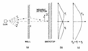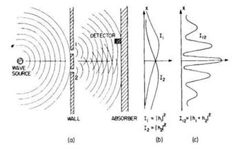 A differenza delle pallottole però, l'intensità I1,2 (cioè la funzione che si otteneva sul rilevatore quando erano aperti entrambi i fori), non era la somma di I1 e I2 , si aveva quindi interferenza fra le due onde .