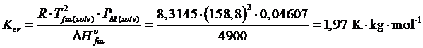 Calcolare la costante crioscopica molale dell'etanolo (PM = 46,07 g mol-1) sapendo che la sua entalpia standard di fusione è ΔH°fus = 4,9 kJ mol-1 e la temperatura di fusione è pari a 158,8K