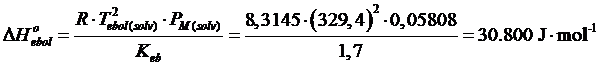 Stimare l'entalpia standard di ebollizione (evaporazione) dell'acetone (PM =58,08 g mol-1), sapendo che la sua temperatura normale di ebollizione vale 329,4K e la sua costante ebullioscopia molale è pari a Keb = 1,7 K·kg·mol-1
