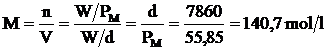 Proviamo ad esempio a calcolare la molarità di un campione di ferro del peso di 50 g sapendo che la densità del ferro è pari a 7860 g/dm3 ed il suo peso molare è pari a 55,85 g/mol.