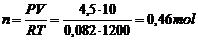Calcoliamo ora quante moli di anidride carbonica devono essere presenti in un recipiente di 10 litri a 1200 K per produrre una pressione di 4,5 atmosfere.