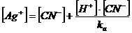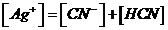 Eseguiamo il bilancio di massa. Per ogni molecola di AgCN che si dissocia, si formano uno ione Ag+ ed uno ione CN-. Ma parte degli ioni CN- si trasformano in HCN, per cui la loro somma (CN- + HCN) dovrà essere uguale al numero totale di ioni Ag+ presenti in soluzione.