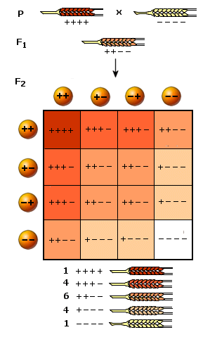 Se incrociamo due individui che stanno alle due estremità opposte dell'intervallo di variabilità, una pianta a semi rosso cupo (tutti e 4 i fattori positivi: genotipo ++ ++) con una pianta a semi bianchi (tutti e 4 i fattori negativi -- --) otterremo una pianta che riceverà ovviamente un gamete ++ da un genitore ed un gamete -- dall'altro. In F1 avremo pertanto un individuo dal colore intermedio, con due fattori positivi e due negativi (++ --).