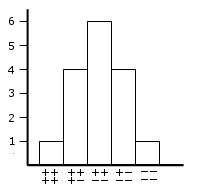 Un carattere controllato da tre geni (6 fattori) presenta in F2 7 classi di frequenza. Per costruire la distribuzione di frequenza dovremmo incrociare un individuo con tutti e 6 i fattori positivi (++ ++ ++) con un individuo con tutti e 6 i fattori negativi (-- -- --). Ovviamente otterremo in F1 individui intermedi con tre fattori positivi e tre negativi (+- +- +-). Se incrociamo tra loro gli individui intermedi, nell'ipotesi che i fattori siano indipendenti e che quindi durante la gametogenesi vi sia una completa ricombinazione tra i fattori positivi e negativi, avremo 23 = 8 tipi di gameti (+++, ++-, +-+, +--, ---, --+, -+-, -++). Posizionando i gameti ai due lati di un quadrato di Punnett otterremo 8 x 8 = 64 combinazioni genotipiche.