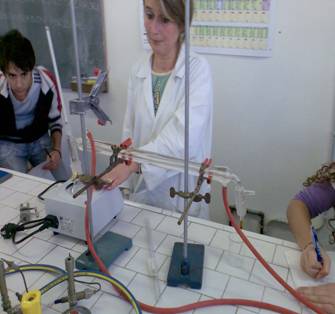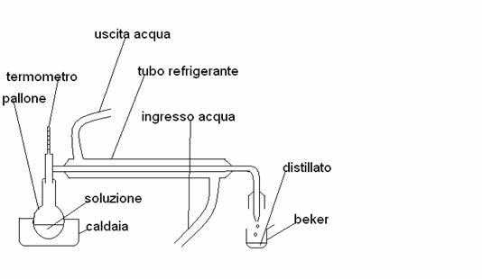 La lezione seguente abbiamo invece sfruttato la tecnica della distillazione per distillare del vino nel quale era contenuto un 10%/12% di alcool. Questa è una tecnica di separazione che sfrutta la differenza dei punti di ebollizione delle diverse sostanze presenti in una miscela. La soluzione iniziale era composta da alcool metilico, alcool etilico e acqua che viene posta in un "pallone" di vetro surriscaldato da una piccola "caldaia". Quando quest' ultima viene accesa la temperatura inizia a salire e quando il termometro, posto all' apice del pallone, raggiunge i 65° C l' alcool metilico inizia ad evaporare. Quando il termometro raggiunge i 78° C anche l' alcool etilico evapora, mentre alla temperatura di 83° C vediamo scendere le prime goccioline nel beker. Queste ultime si sono formate grazie alla condensazione dei gas che entrando nel tubo refrigerante ( doppio tubo di un vetro speciale - smeriglio - nel quale nella parte più interna scorre il distillato ottenuto mentre nel tubo esterno scorre acqua) vengono raffreddati a contatto con l' acqua e formano, nel nostro caso, la grappa. Dal distillato ottenuto notiamo che l' alcool non da il colore al vino, infatti se così fosse la miscela finale sarebbe rosso scuro come quella iniziale e non trasparente. La trasformazione che ha luogo nella distillazione e una trasformazione fisica dato che c'è un passaggio di stato.