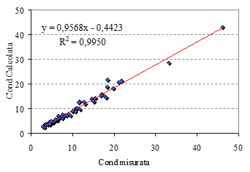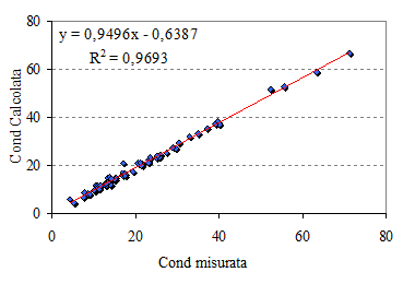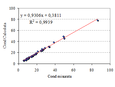 Un'indicazione immediata dalla bontà del monitoraggio si ottiene mettendo in grafico la somma delle cariche anioniche rispetto alle cationiche e la conducibilità calcolata rispetto alla misurata. Più specificatamente il primo tipo di confronto risulta essere un buon indicatore della completezza dei parametri misurati. Per i dati relativi al triennio considerato si è ottenuto un R2 medio per le tre stazioni sul confronto delle conducibilità di 0,9864, mentre per quanto riguarda il confronto anioni/cationi il valore dell'R2 medio è pari a 0,9856, confermando la validità delle analisi effettuate; a titolo di esempio si riportano i casi relativi all'anno 2007 (Fig. 31 A-B, 32 A-B e 33 A-B).