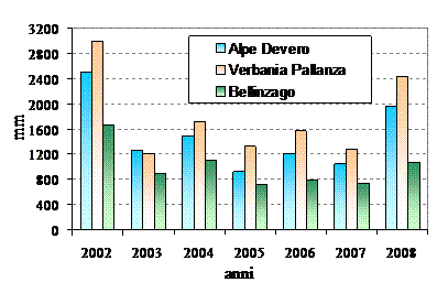 Fig. 34 Piovosità annuale (periodo 2002-2008) nelle stazioni di monitoraggio di Alpe Devero (alpina), Verbania Pallanza(urbana) e Bellinzago (pianura). |