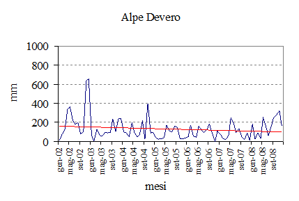 Fig. 35 Piovosità mensile (periodo 2002-2008) nella stazioni di monitoraggio Alpe Devero. |