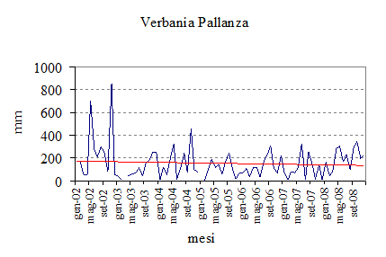 Fig. 36 Piovosità mensile (periodo 2002-2008) nella stazione di monitoraggio Verbania Pallanza. |