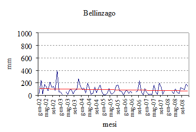 Fig. 37 Piovosità mensile (periodo 2002-2008) nella stazione di monitoraggio Bellinzago. |