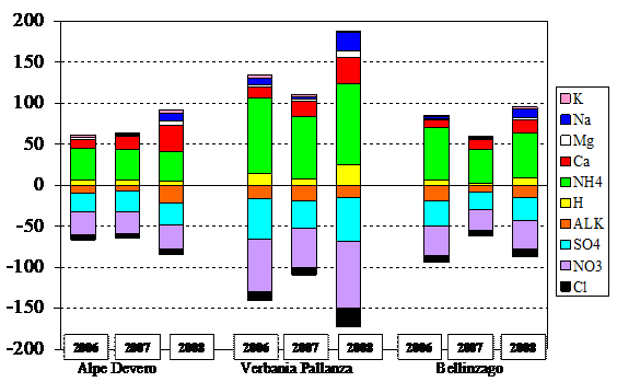 Fig. 38 Flussi annuali (meq m-2a-1) relativi allo spettro ionico per il triennio 2006-2008. Nella parte superiore del grafico sono riportati i cationi, in quella inferiore gli anioni. |