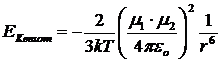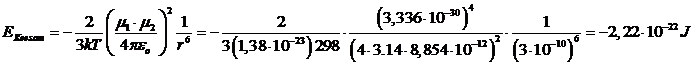 Ad esempio, a 25°C l'energia di interazione per una coppia di molecole con μ = 1 D (= 3,336 10-30 C m) alla distanza di 0.3 nm (= 3 10-10 m) è di